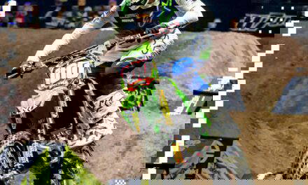 A reimagined blue and black livery sees a black tank, mudguard, seat unit, and belly pan complemented by blue radiator shrouds and side panels, all offset by standout fluro accents around the headlight and on the belly pan, plus the 750 graphic on the seat unit and rim decals.