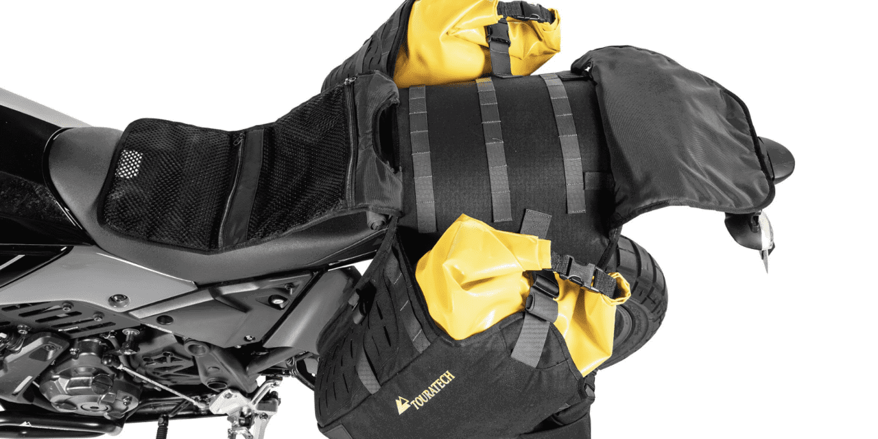 Despite all the innovation, the Touratech developers have taken great care to ensure that the Discovery2 retains the tried and tested features of its predecessor. This means that the soft luggage system can be securely attached to almost any adventure bike without a carrier using just four straps. To do this, the system is placed over the pillion seat and lashed to existing attachment points on the frame and rear frame so that it is secure on the piste. This is where the modified buckles really come into their own. The pre-shaped design of the luggage system ensures that the rear bags fit snugly against the vehicle. The use of a separately available heat protection plate is recommended for high-mounted exhaust systems.